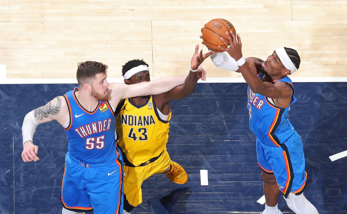 雷霆在第五战的40个运动战进球中有24次助攻,但他们在步行者主场的两场比赛里,74个进球只有27次助攻。总决赛至今,雷霆的整体转移球表现下滑——场均传球216次,比68胜的常规赛减少约25%,部分原因显然是面对主场作战的对手时,对方防守压迫性更强。